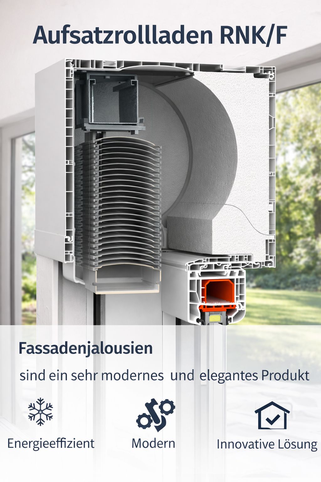 Durch die Vergrößerung der Revisionsöffnung des Rollladenkastens RNK/E durch Versetzen des Basisprofils zum Raum hin kann eine äußere Abdeckung in der Variante RNK/F, d. h. in der Version mit Fassadenjalousie, für die Montage im Inneren und an der Außenseite hergestellt werden. Die Lösung weist alle Eigenschaften des Rollladen RNK/E auf.