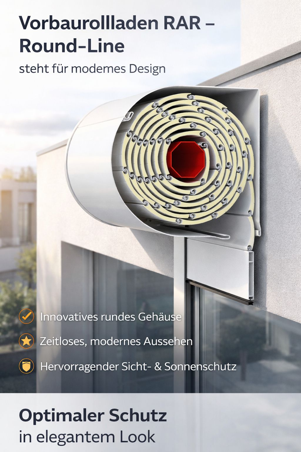 Die Vorbaurollladen Round-Line (RAR) sind eine Variante der Vorbaurollladen, die mit einer abgerundeten Revisionsklappe, die sich von außen, von der Vorderseite des Kastens aus, öffnen lässt, und mit abgerundeten Auflagen auf die Führungen ausgestattet ist. Durch die dekorative Wölbung der Revisionsklappe ist es nicht möglich, diese zu überputzen – der Kasten ist von außen vollständig sichtbar.